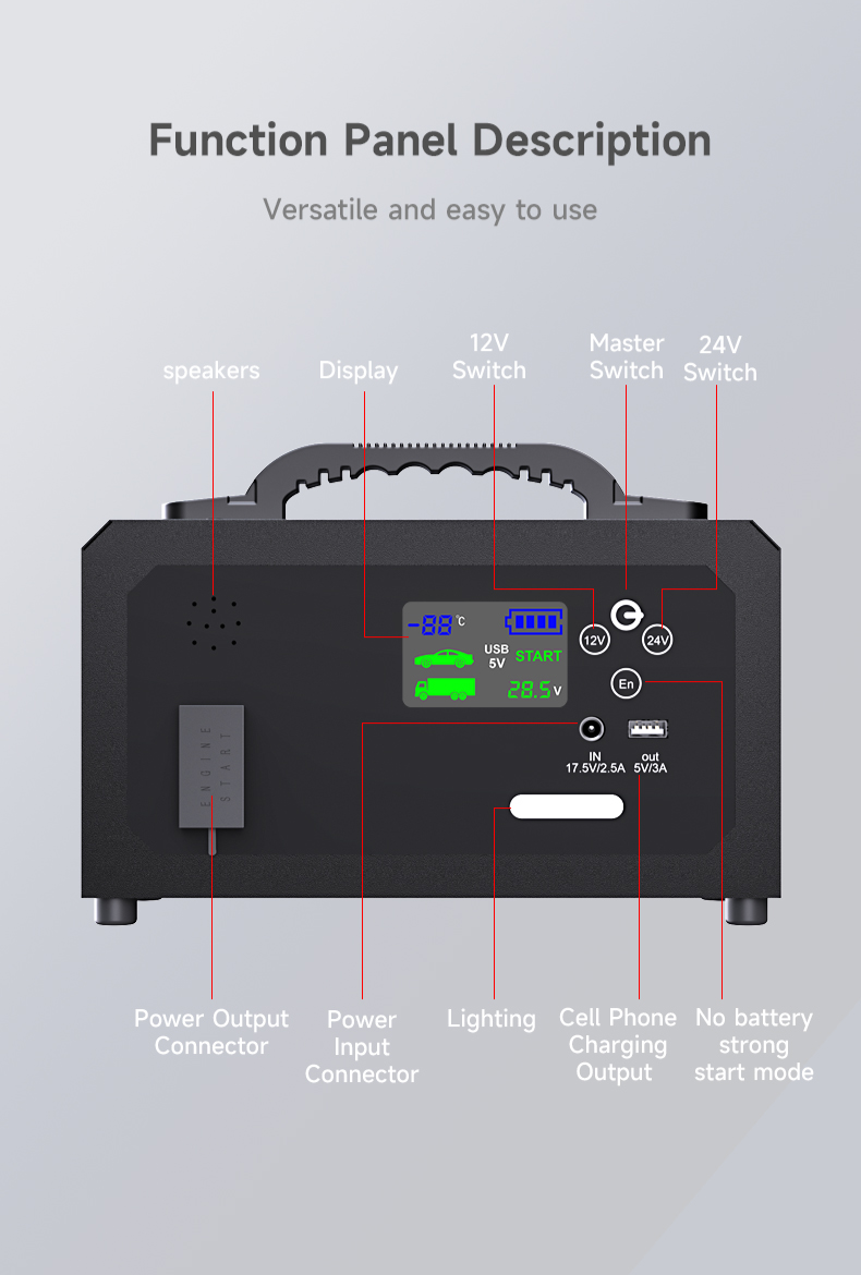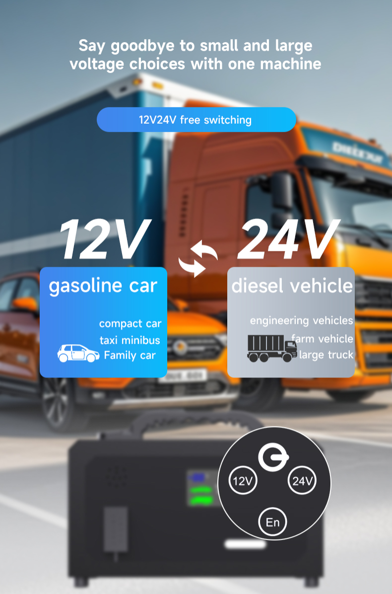 It is heavy strong starter ,about 3.5kgs with box, 2.6kgs without box, i tried with my car, super,can easily switch the voltage to be 12v or 24v , it also can charge my phone with usb
