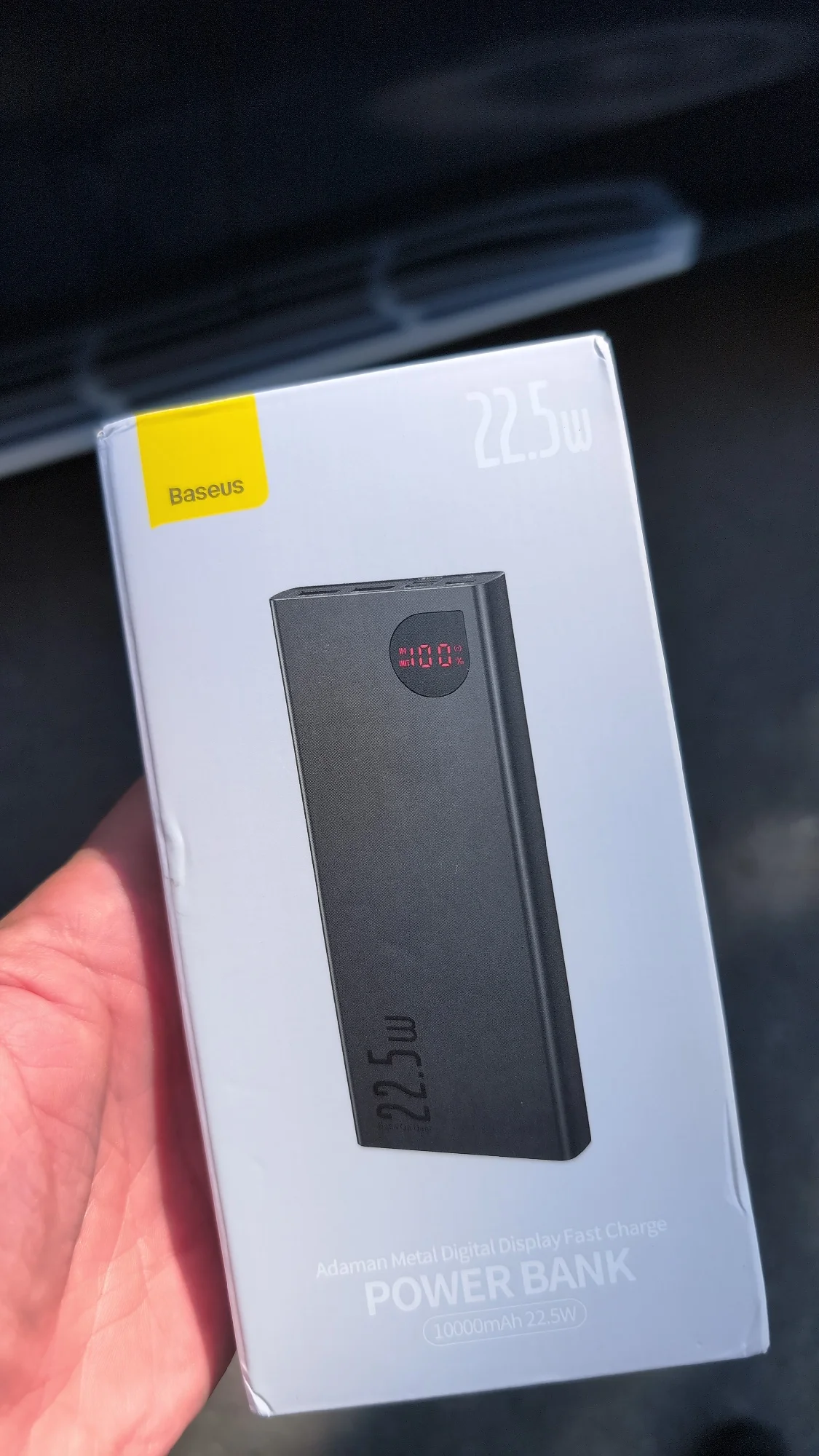 Excellent 10000mAh power bank, the size of a phone, just a little thicker. Weight 284 g, metal body. Fast charging works great. Baseus, as always, makes high-quality products.