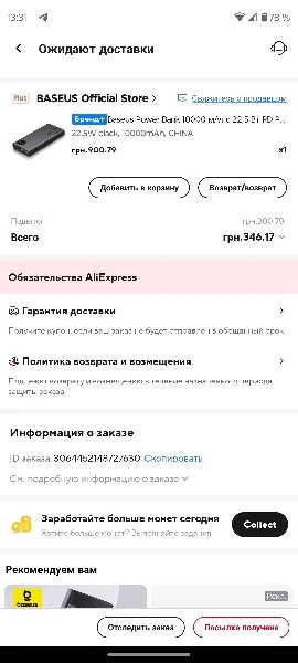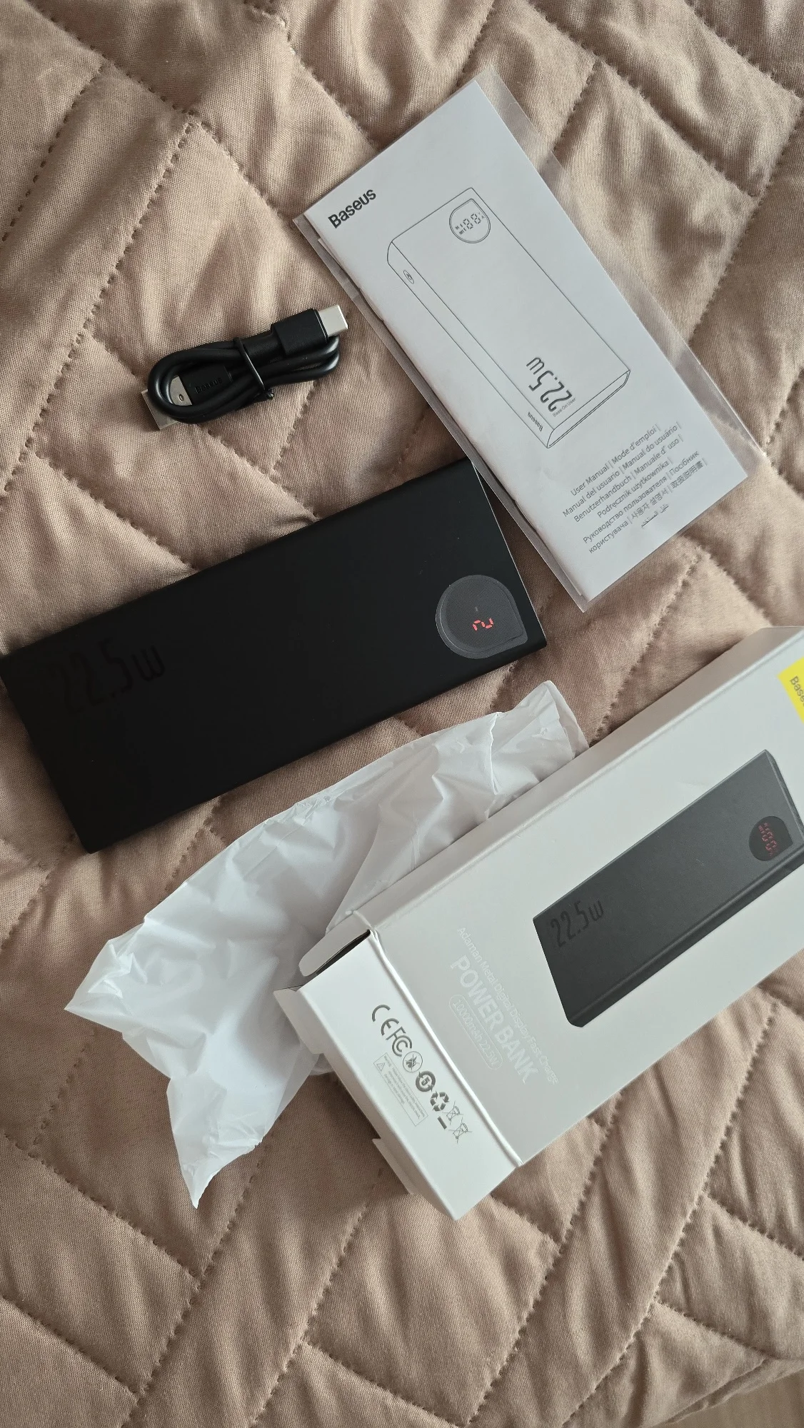 Order integrity. Delivery speed (only three days). Power bank charged to 85%. I definitely recommend this seller. I hope the power bank will serve faithfully and reliably. The device itself looks very premium. From Baseus, you don't have to expect anything else.