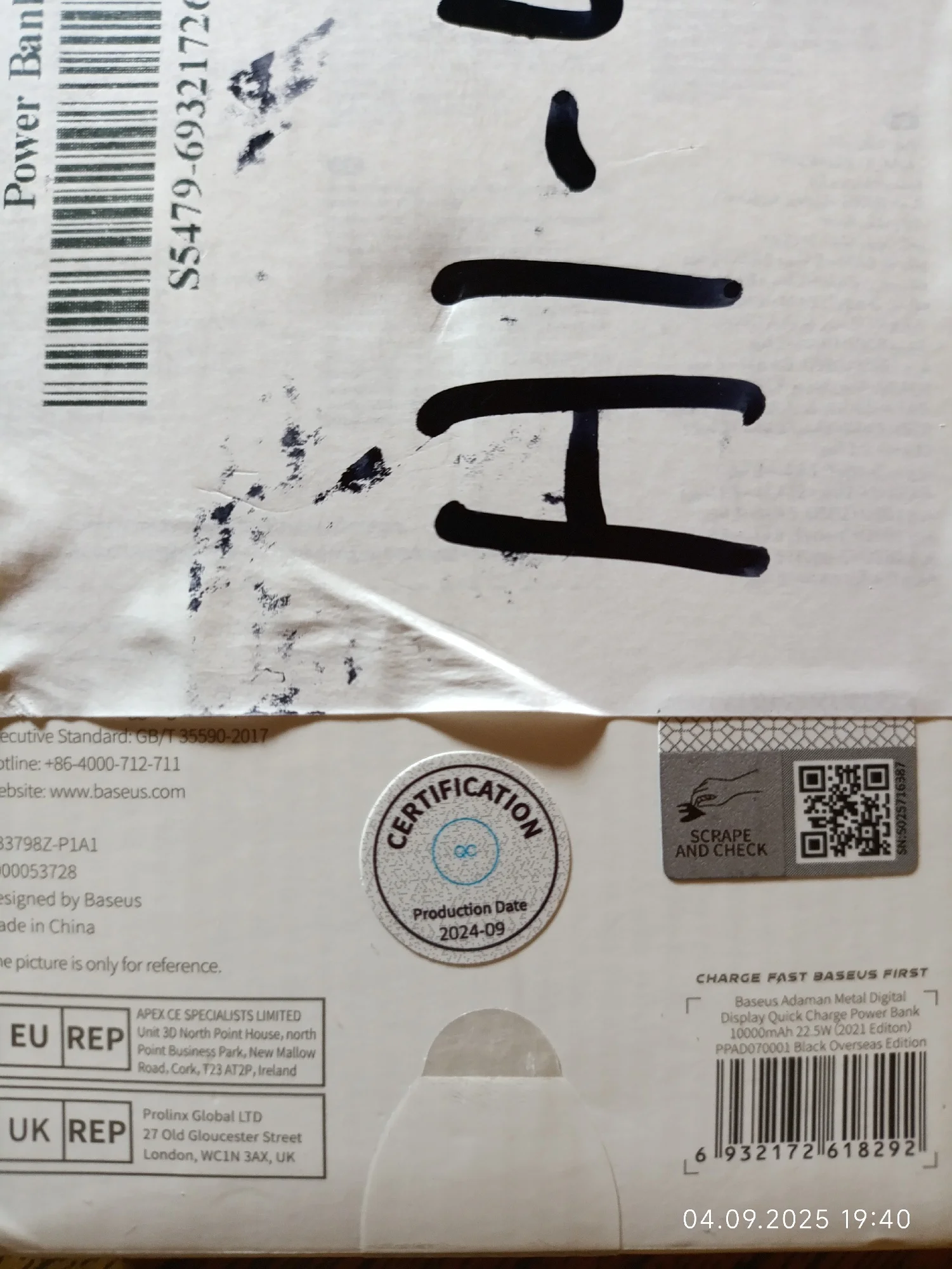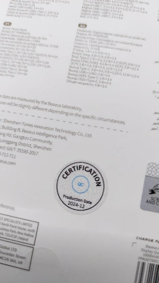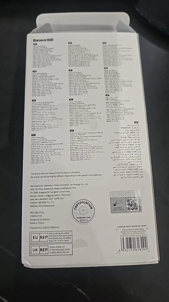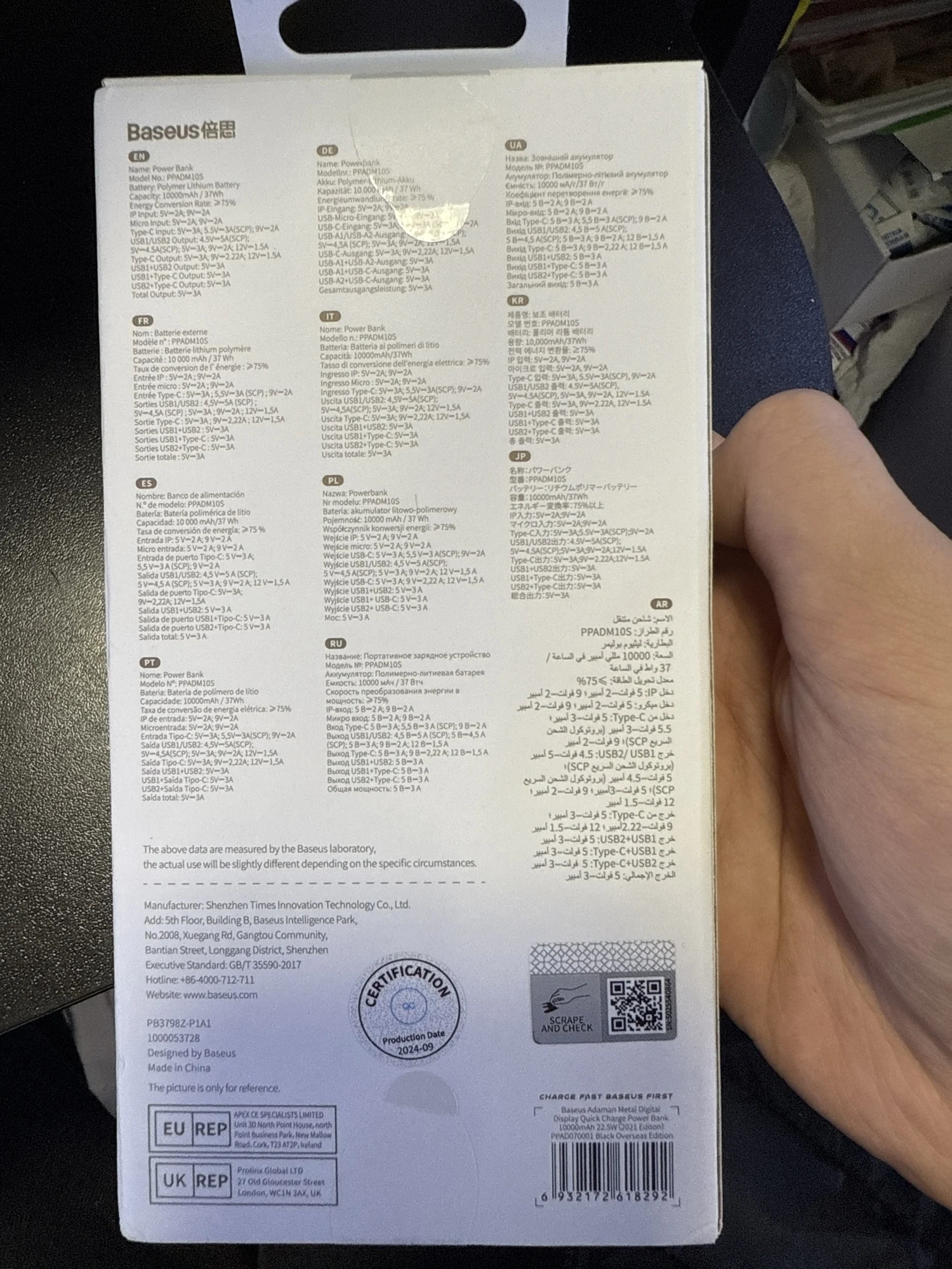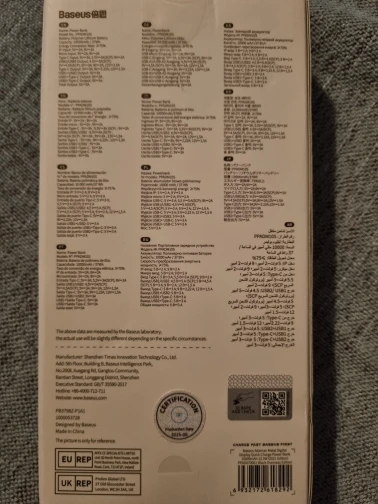The package arrived in Ukraine in 12 days. The packaging, the box - everything is intact, without damage. The year of manufacture is 2024. There is an instruction manual in several languages, including Ukrainian. The power bank was charged to 80%. Everything works perfectly! I recommend it.