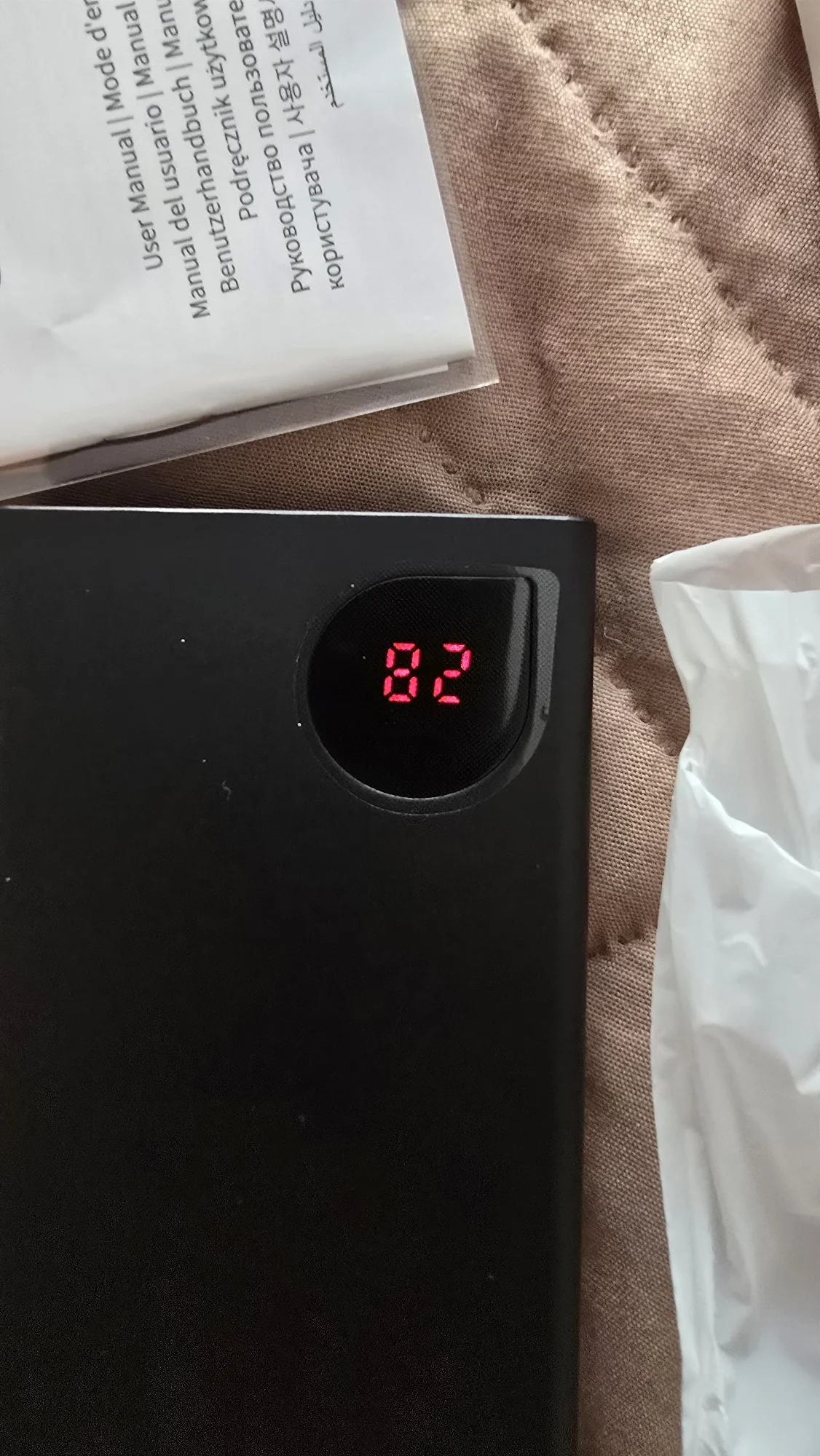 Quite weighty, shows the current charge on the screen, pressing the side button displays the charging current and voltage. I tried different power banks, this is the first one that my Huawei P20 got along with for fast charging; I also use a Baseus cable. It's unclear whether the power bank itself can charge quickly and what it needs for that.