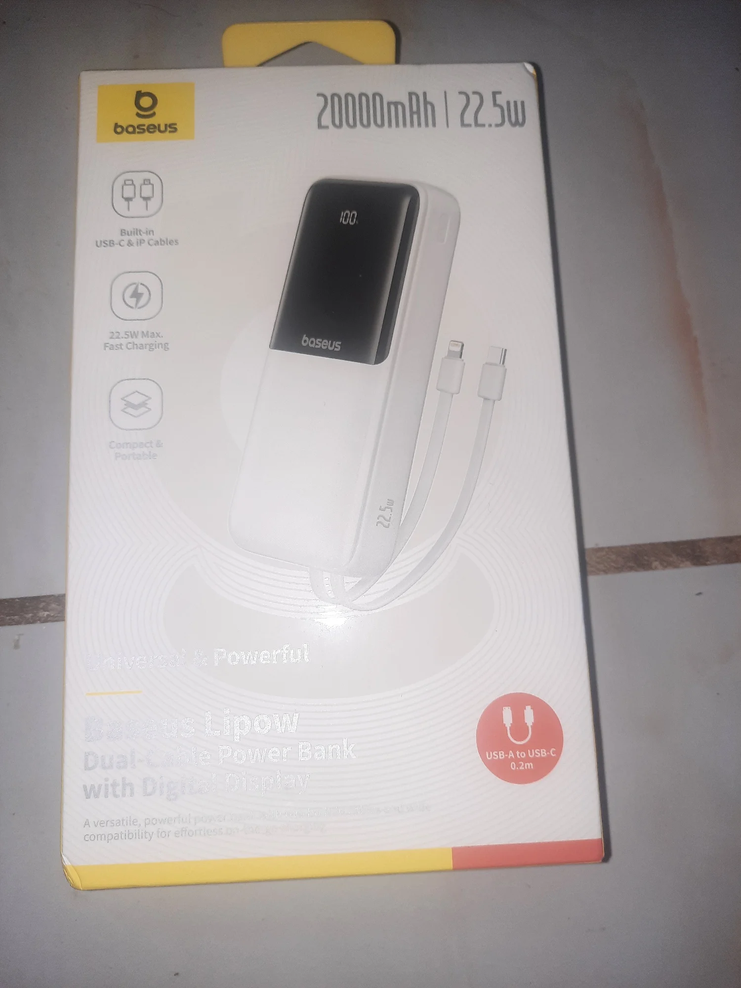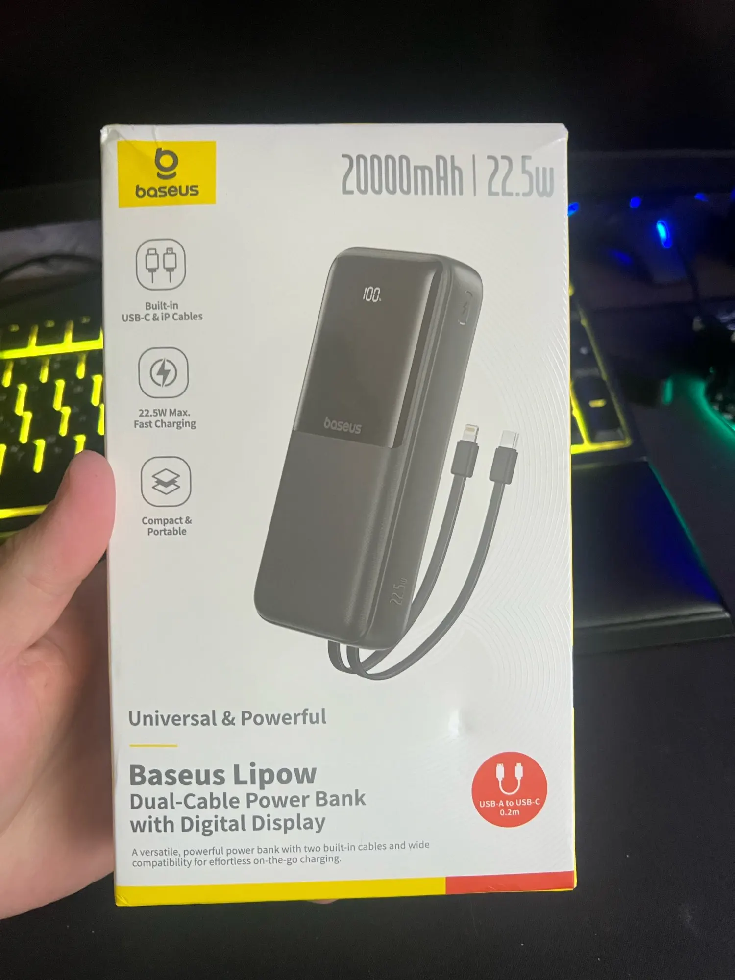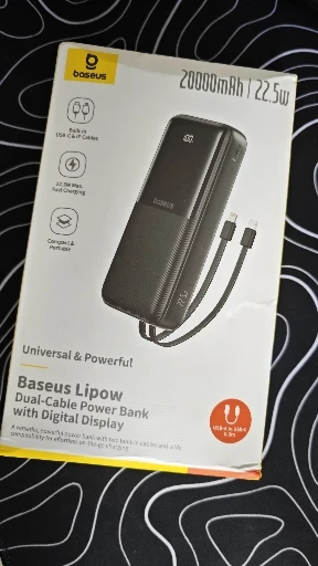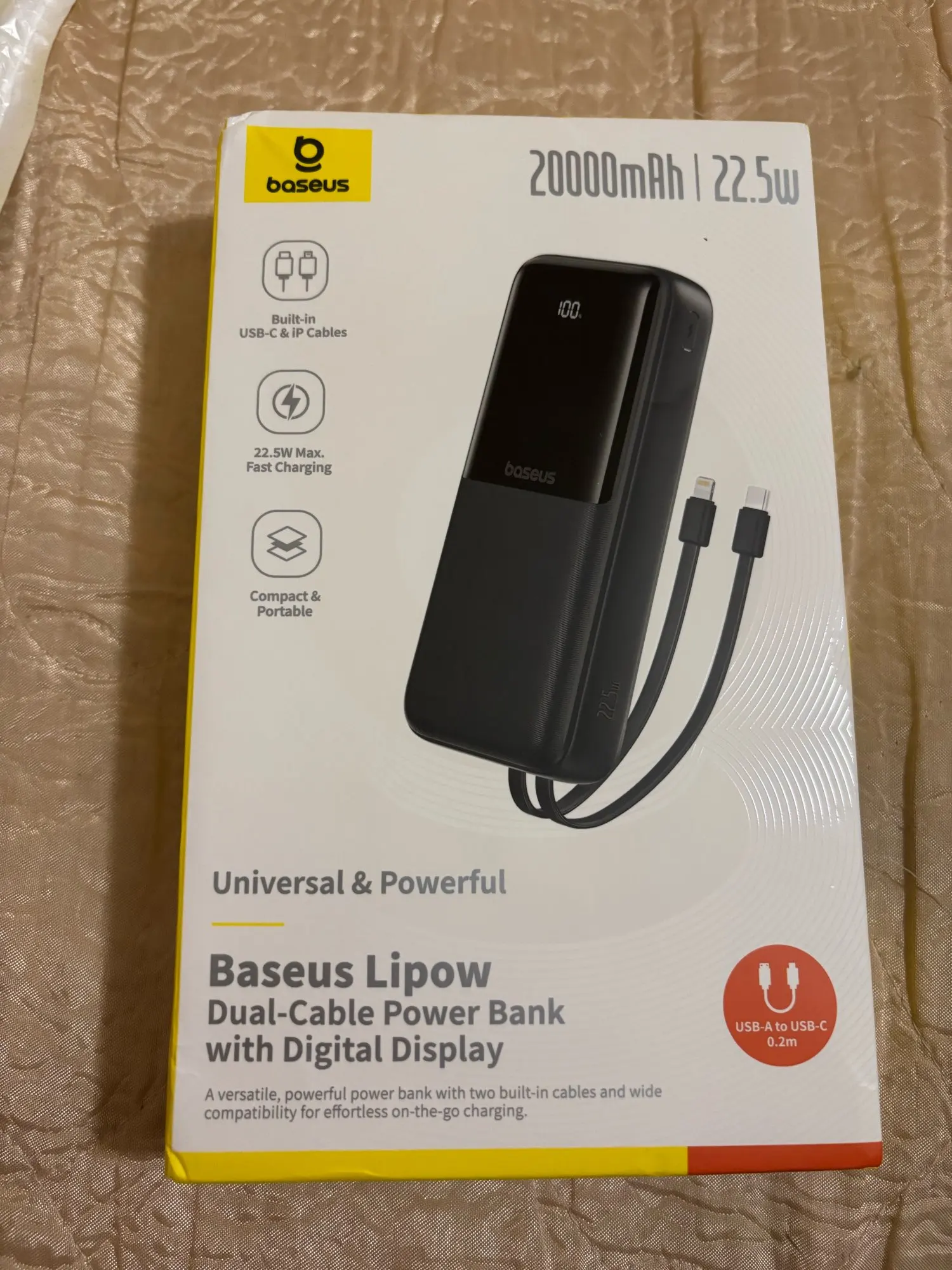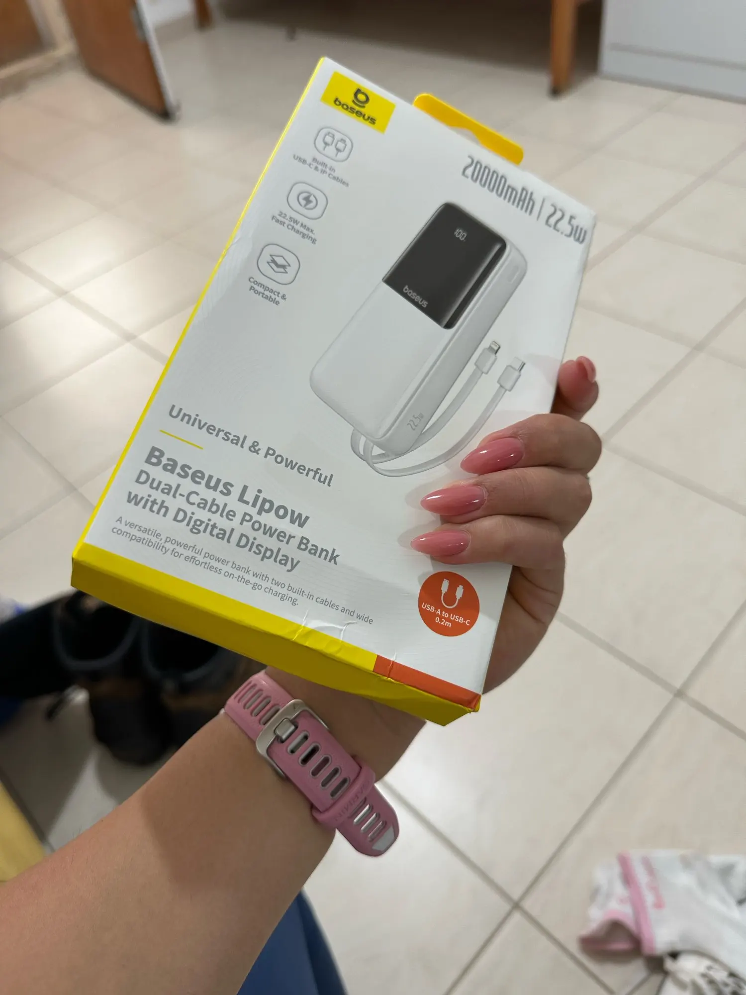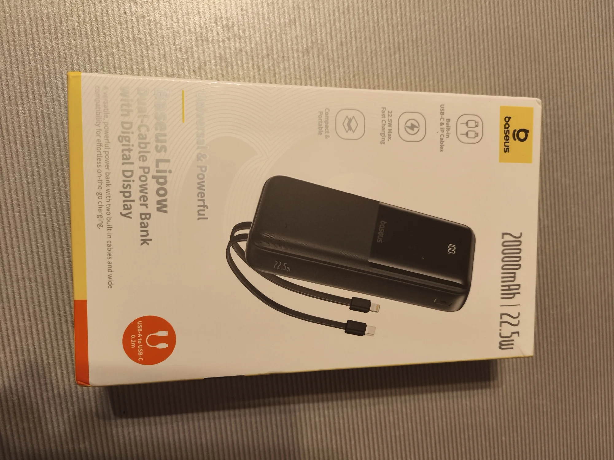 The Baseus Lipow 20,000mAh Powerbank is compact, powerful, and super practical. Thanks to 22.5W fast charging and integrated cables, it charges devices quickly and without additional cables. The LED display accurately shows the battery level – ideal for on the go!