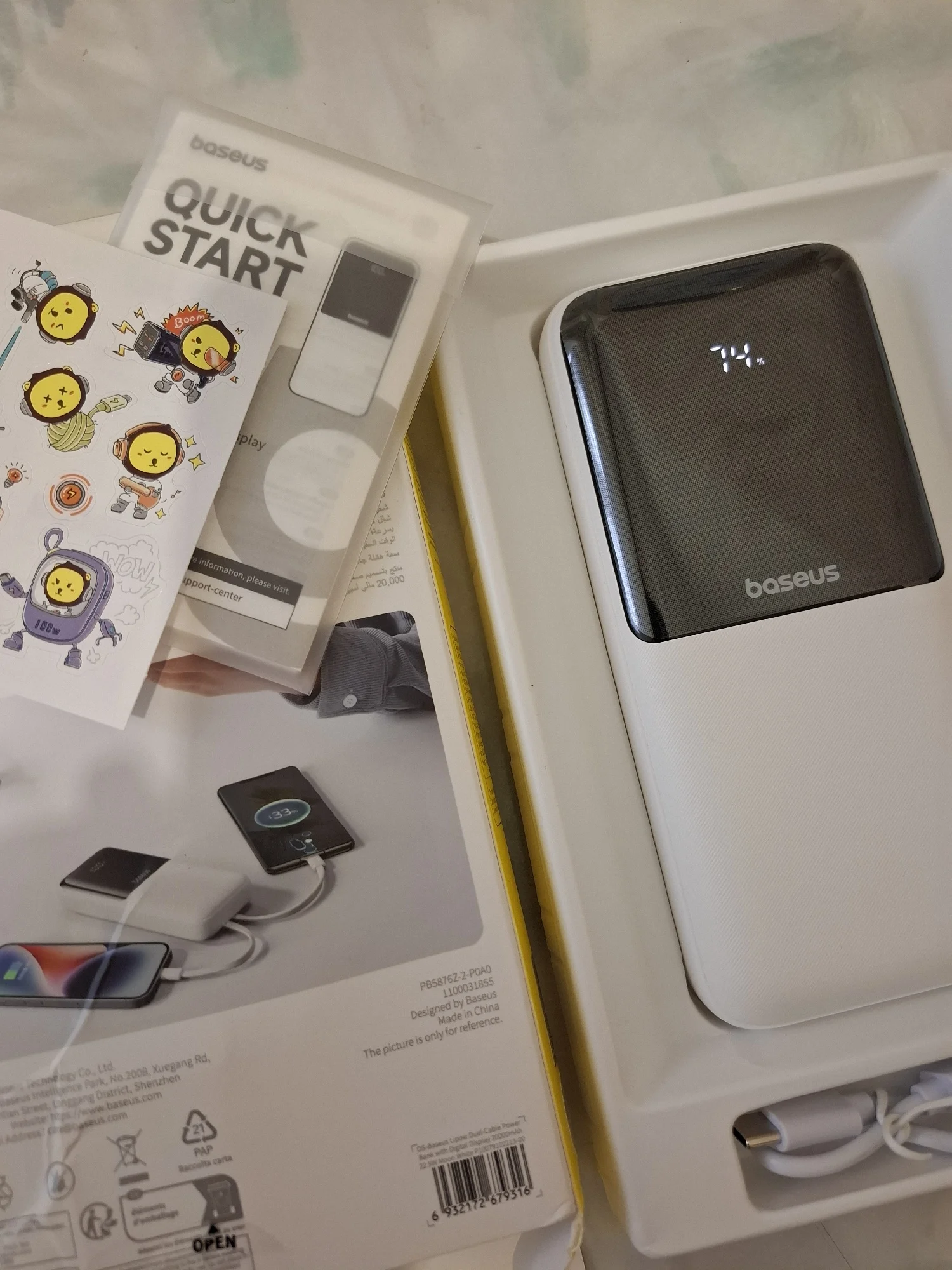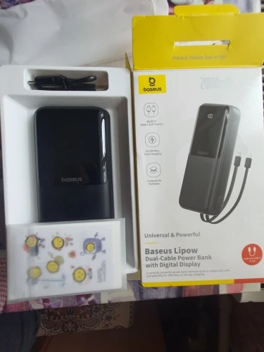 Exactly what I expected arrived, a very high-quality power bank, quite heavy. There is a touch button on the side showing the charge level, high-quality cables, and several inputs for my own wires. The package included funny stickers.