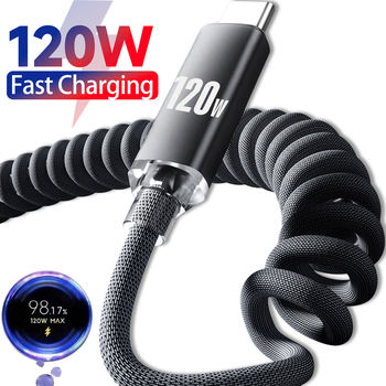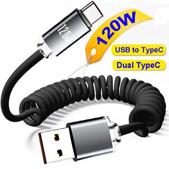 Retractable USB Type C Cable 120W Quick Charging Data Cord Spring Type-C Car Charger Cable for Samsung Xiaomi iPhone Huawei